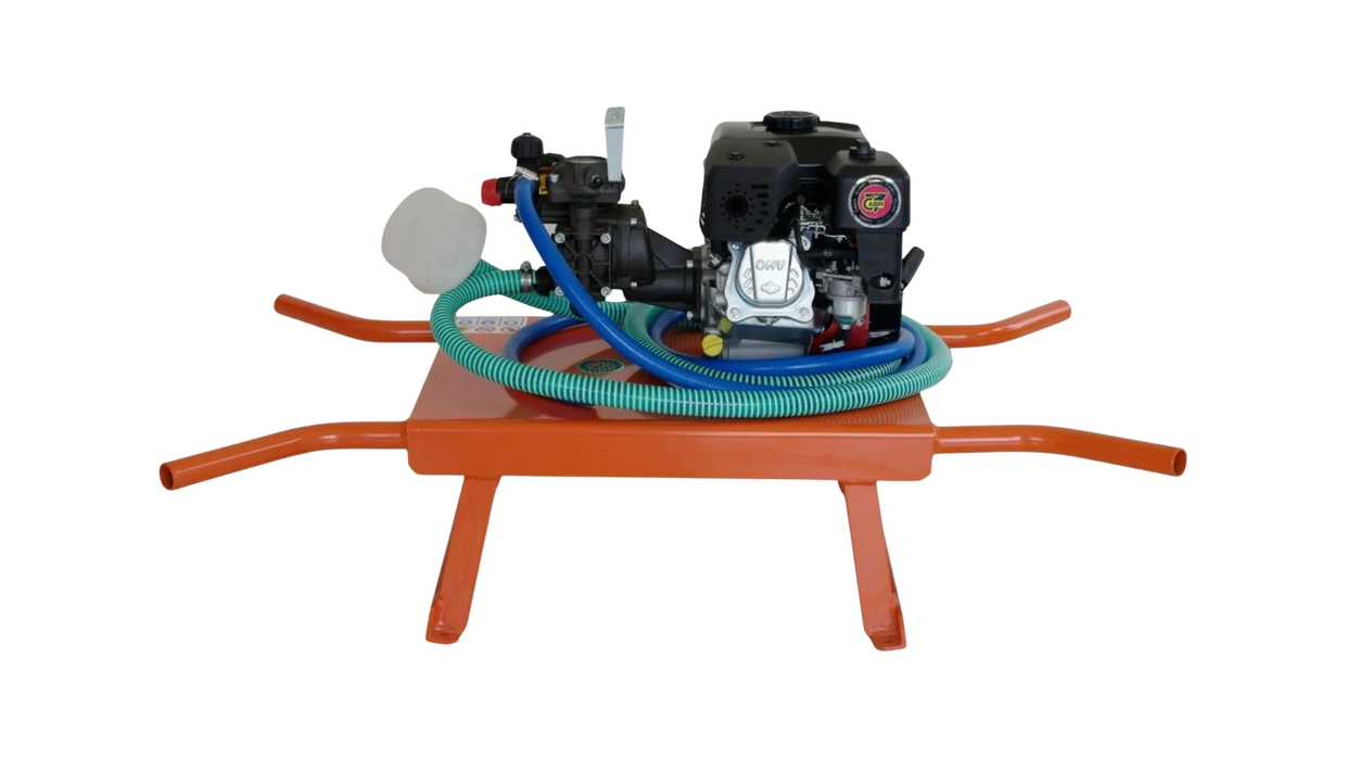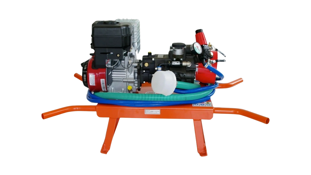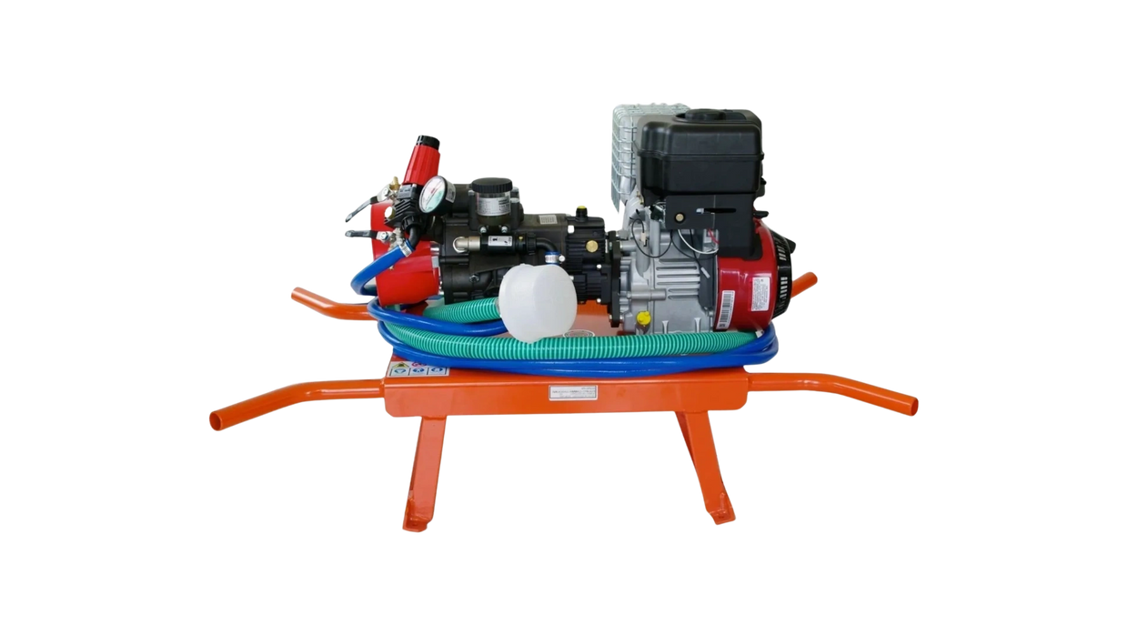 Equipo estacionario de alto rendimiento para trabajos exigentes. Bomba de diafragmas Annovi Reverberi AR-503 con caudal de 55 litros por minuto y presión máxima de 600 psi. Motor KTC de 9 HP a gasolina. Cuenta con llave reguladora de presión RM 40 para hasta tres salidas de manguera de 200 metros, manómetro en glicerina con sistema by-pass, mangueras de succión y retorno, y plataforma metálica reforzada con pintura resistente a agroquímicos. Garantía de 1 año por defectos de fábrica.