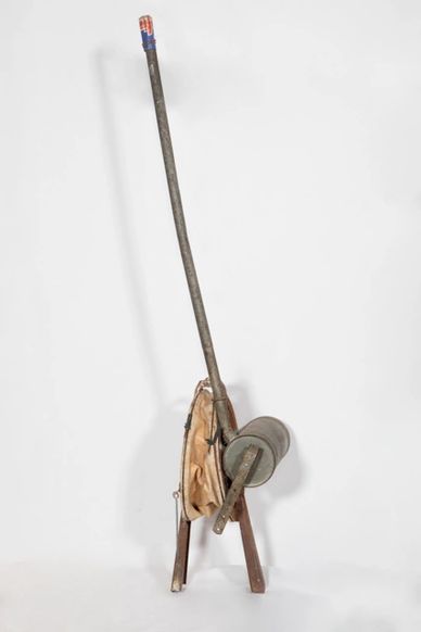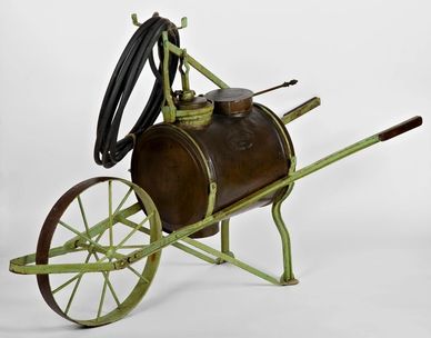 Irrigatore per viti con bottiglia di rame montata su un carrello di ferro, equipaggiato con una pompa di metallo alla quale sono collegati un lungo tubo di gomma e un cannoncino di metallo.